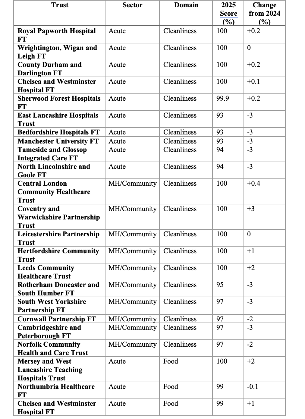 The divide is perhaps most visible in the contrast between consistent top performers and repeat strugglers. Chelsea and Westminster Hospital FT once again featured among the highest scorers across cleanliness, food and privacy, an unusual triple distinction in a system where strengths often vary by domain. Several northern and London providers also dominated food rankings, with perfect or near perfect catering scores. Meanwhile, East Lancashire Hospitals Trustremained among the lowest scorers for both cleanliness and food, despite local leaders stressing that inspections capture only a snapshot in time. In privacy and dignity, West Hertfordshire and others improved significantly year on year yet still remained in the bottom tier, illustrating how deep structural issues such as outdated wards and shared facilities can blunt short term operational fixes. Among mental health and community providers, volatility was equally striking. Some achieved 100 per cent cleanliness. Others recorded declines of up to seven percentage points in food or privacy, often attributing setbacks to estate age or supplier transitions. The pattern is clear. Performance is not uniformly drifting. It is fragmenting.